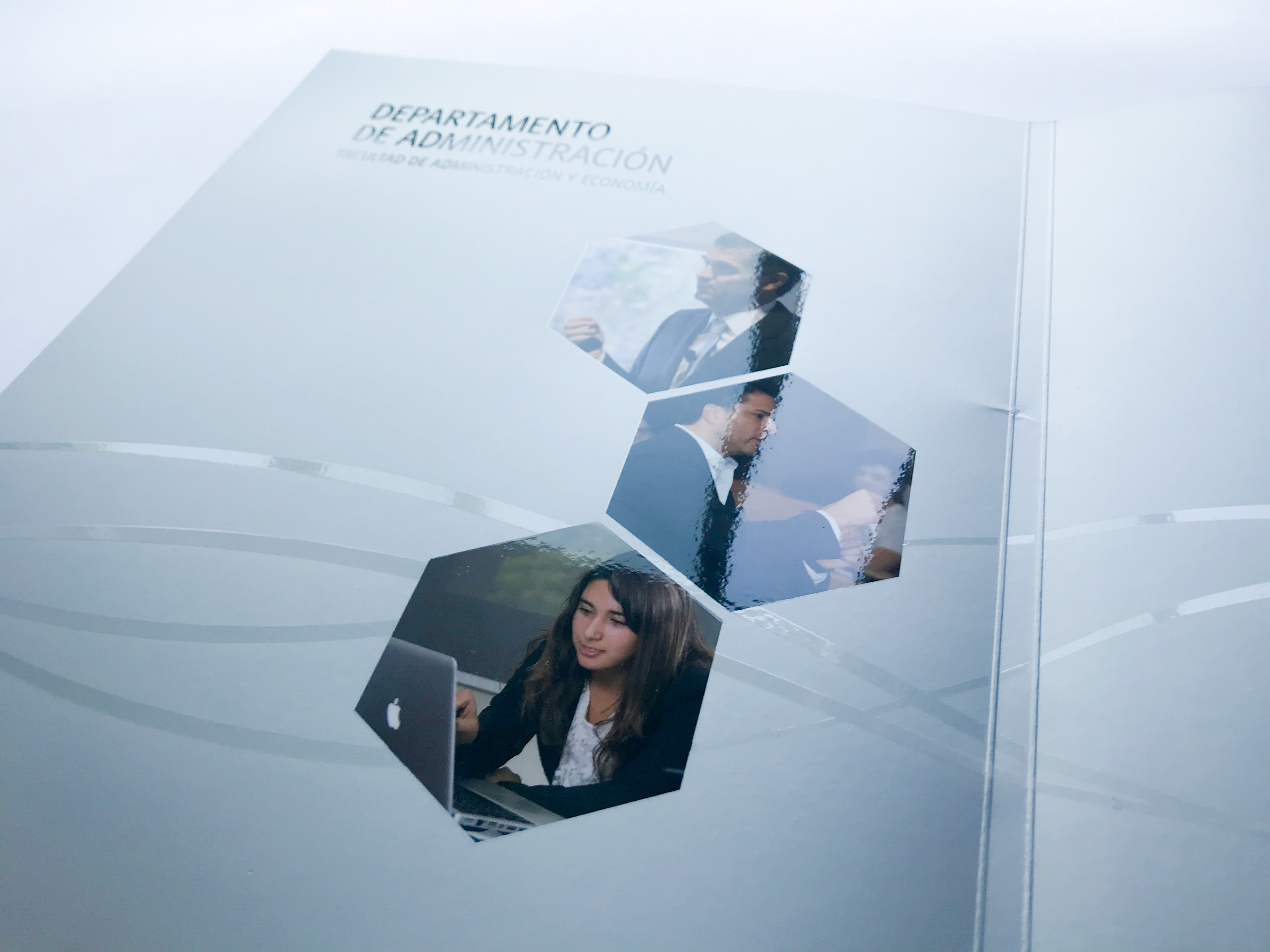 Desarrollo de carpeta por encargo del Departamento de administración de la Facultad de Administración y Economía, Universidad de Santiago de Chile. Para el desarrollo de la carpeta se realizaron terminaciones de barniz brillante con reserva uv.