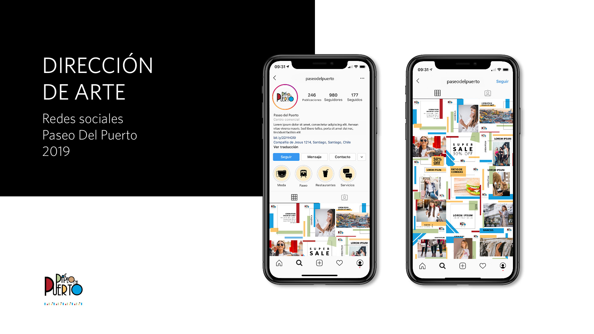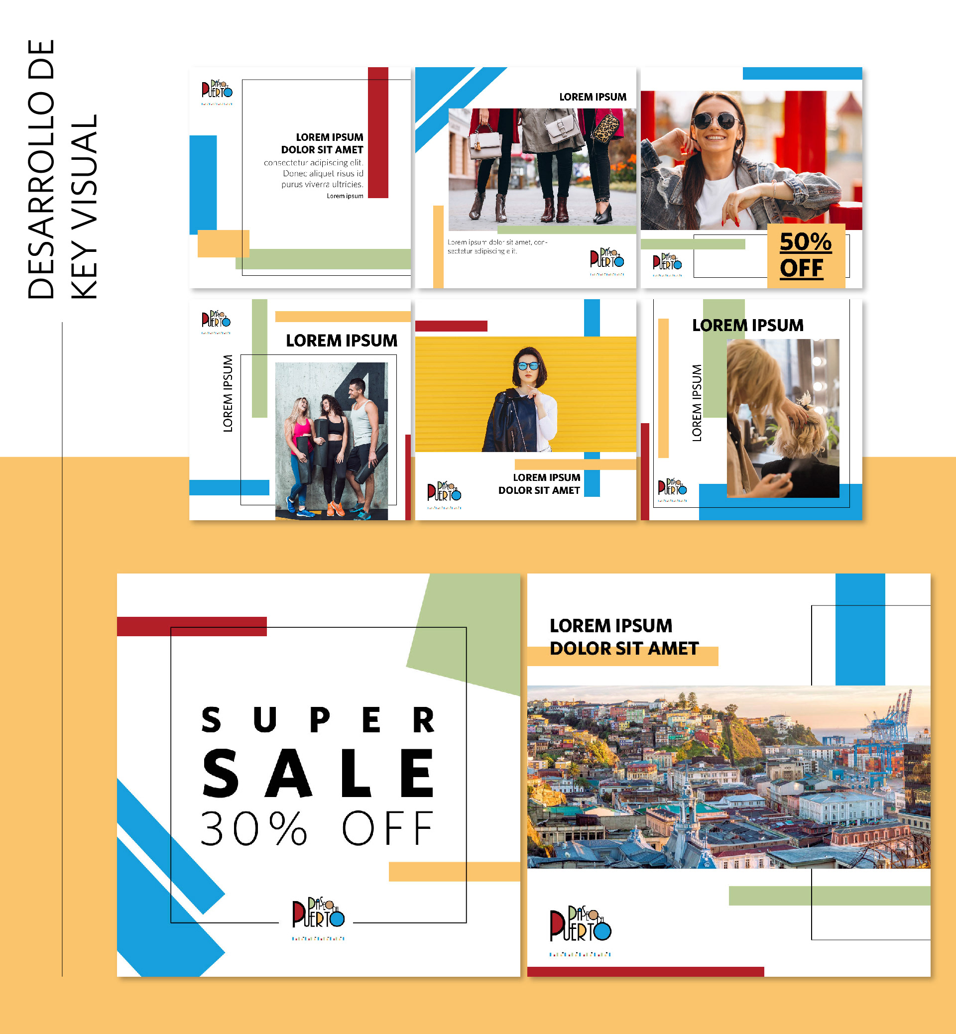 Desarrollo de dirección gráfica para rediseño de las redes sociales del centro comercial Paseo del Puerto, basado en el publico objetivo y los colores corporativos de la marca.